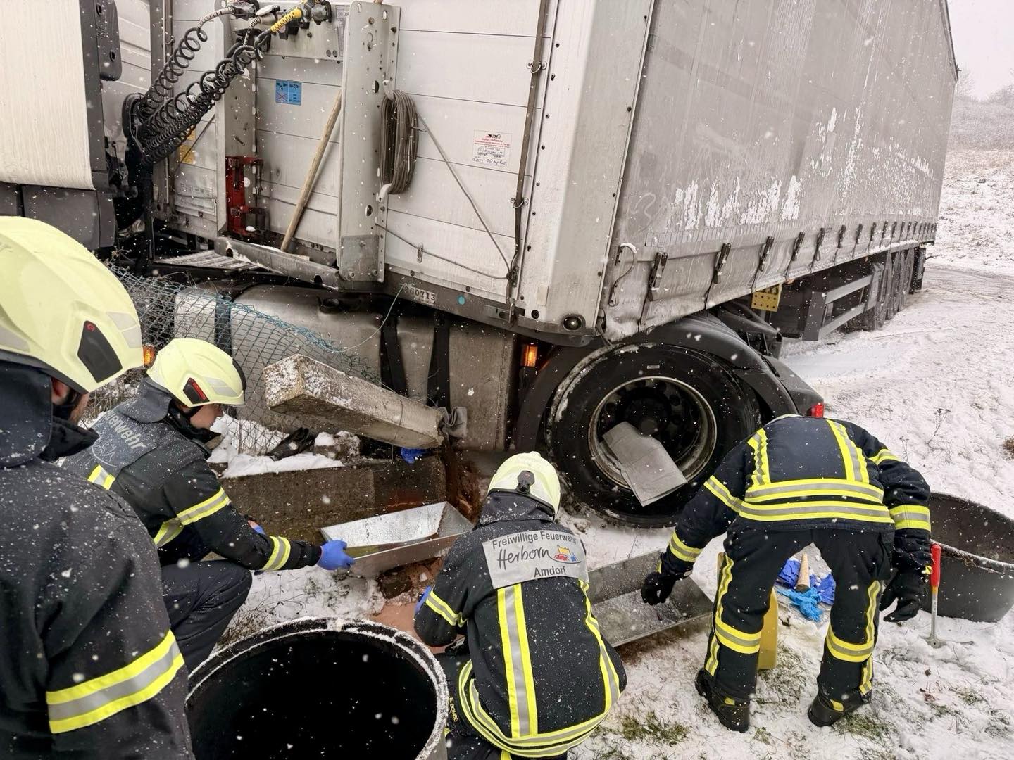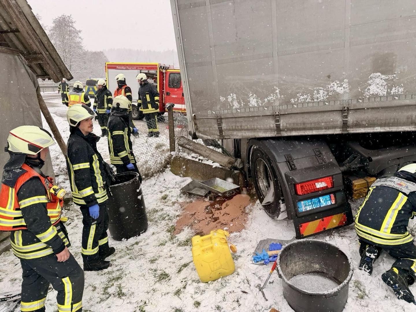 Vor Ort stellte sich die Lage folgendermaßen dar: Ein LKW-Fahrer hat auf schneebedeckter Fahrbahn die Kontrolle über sein Fahrzeug verloren. Dabei wurde der Dieseltank beschädigt. Durch die Feuerwehr wurde das Fahrzeug gegen wegrollen gesichert und der Diesel aus dem beschädigten Tank aufgenommen und anschließend abgepumpt.